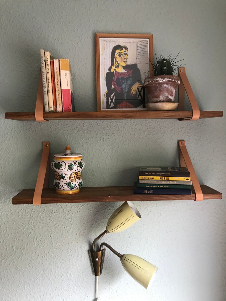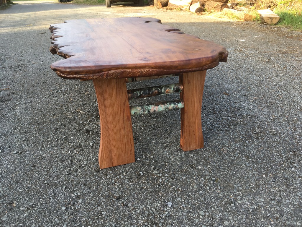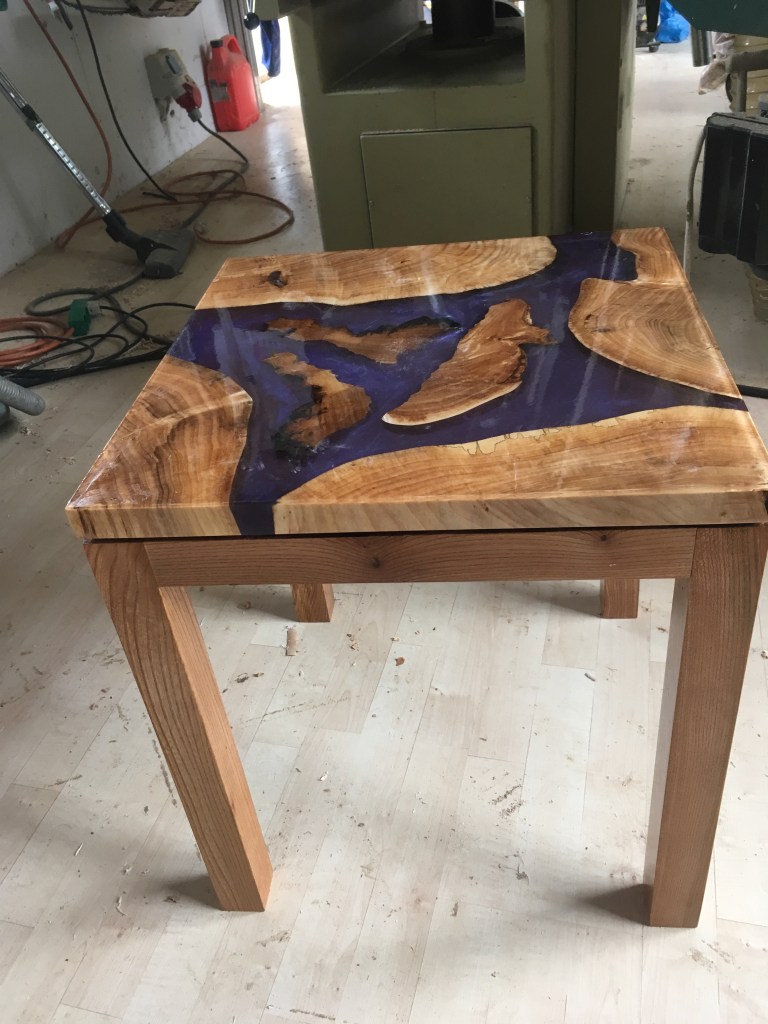 Bord i elmetræ med indlægBænke i røget eg, torper kilet op med kristtjørn Bord med elmetræstel og plade i poppel m. indlæg af kunsharpiksHylde i eg m. stroppe i kernelæder 350 kr. stk./ 600 kr. ved køb af to