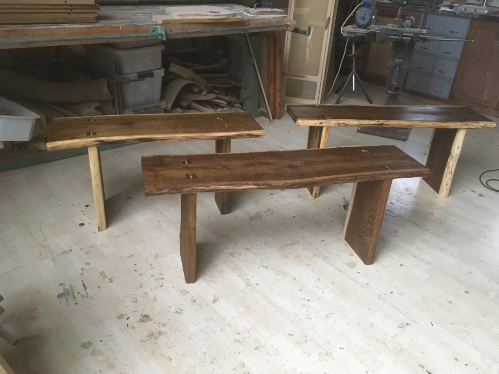 Bord i elmetræ med indlæg Bænke i røget eg, torper kilet op med kristtjørnVitrineskabe i pæretræ m. hængsler af blomme 2800 kr. stk/ 5000 kr. v. 2 stk.Hylde i eg m. stroppe i kernelæder 350 kr. stk./ 600 kr. ved køb af toBord i asketræ